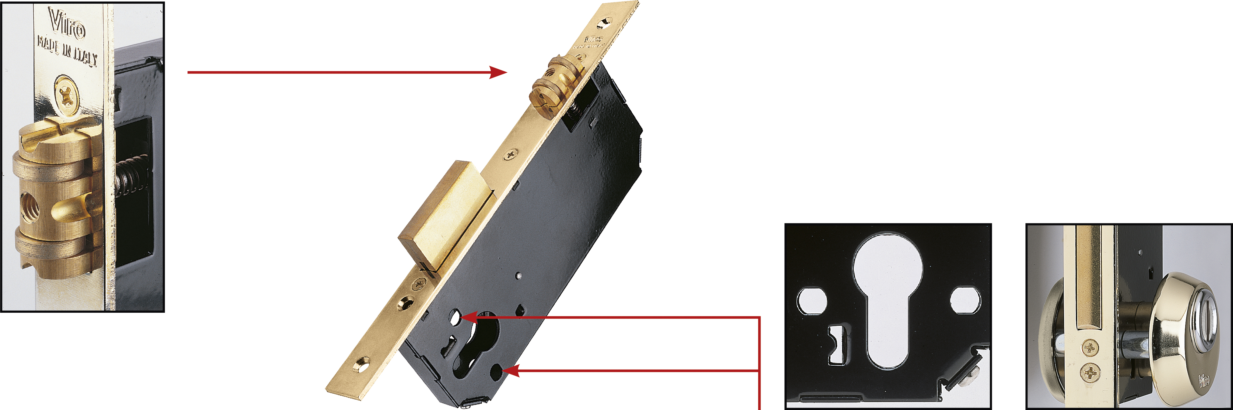 Le serrature da infilare Viro dotate di rullo sono specifiche per porte che possono essere aperte sia a tirare che a spingere e sono compatibili con la maggior parte dei cilindri in commercio.